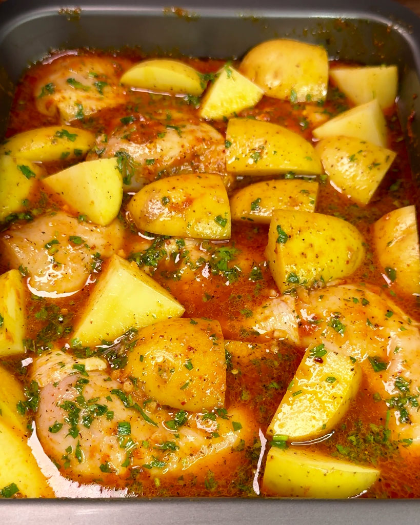 As the dish bakes, the flavors blend together, creating tender chicken infused with a savory tomato and herb mixture, while the potatoes become soft inside and slightly crispy on top.