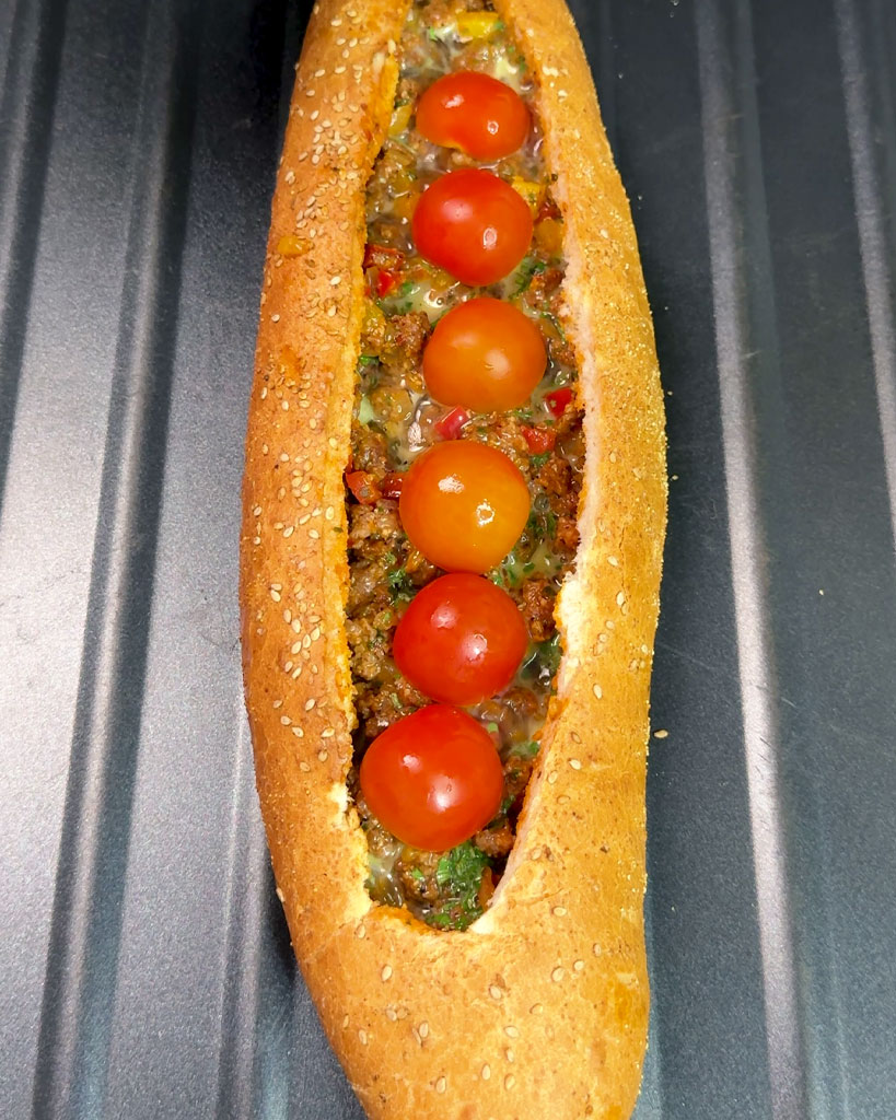 The bread is then filled with the meat, topped with seasoned eggs, juicy cherry tomatoes, and melted mozzarella cheese. Once baked, the result is a perfect combination of crispy bread, juicy filling, and creamy melted cheese.