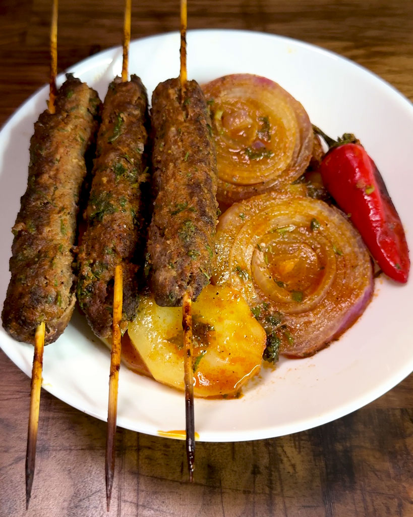 - Step 1: Prepare meat skewersMix minced meat with garlic, parsley, spices, salt & pepperShape onto skewers Step 2: Prepare baseArrange potatoes and onions in a baking dishAdd a little salt, pepper, and olive oilStep 3: AssemblePlace skewers on topAdd hot chili peppers Step 4: Add sauce In a bowl, mix:WaterTomato pasteFresh parsley SpicesPour the sauce over the potatoes and skewersStep 5: BakeCover with foil and bake at 180°C (350°F) for 30–35 minutesRemove foil and bake another 10–15 minutes until golden
